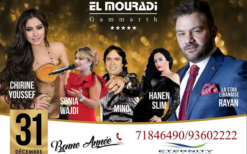 Ce réveillon à El Mouradi Gammarth s'annonce très festif avec une soirée qui sera animée par: La Star Cherine Youssef, Sonia Wajdi, Minou, Hanen Slim et la star Libanaiss Rayan. Le package de cette soirée comporte un forfait Soirée avec dîner gala + hébergement & brunch du Jour de l'An pour adulte.