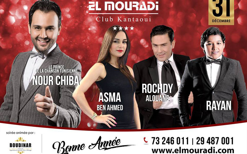 En cette fête de la Saint Sylvestre 2018, El Mouradi Club Kantaoui 4* Sousse vous donne rendez-vous pour une soirée animée par: le prince de la chanson Tunisienne Nour Chiba, la bellissima Asma Ben Ahmed, la super star Rochdy Alouane et le talentueux Rayan. Accompagnés par la troupe Boudinar.