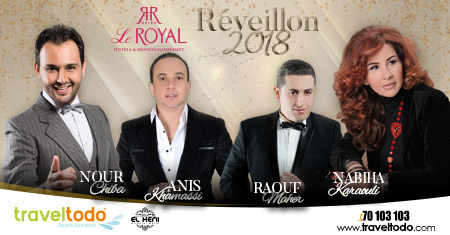 Passez un Nouvel An 2018 magique au Royal Hammamet 5* avec vos artistes préférés: le Prince de la chanson Tunisienne Nour Chiba, la super star Nabiha Karaouli, la vedette Anis Khamassi ainsi que Raouf Maher. Avec la participation de la troupe orientale du Maestro Haithem El Heni.