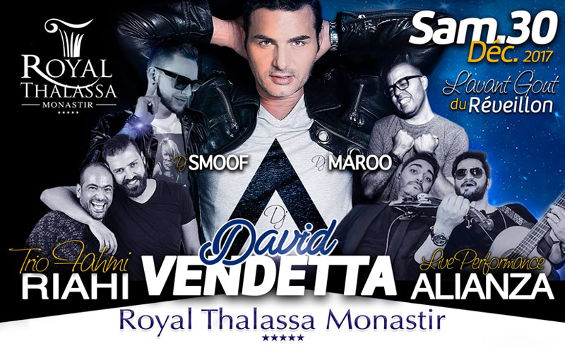 Samedi 30/12/2017 : Le Royal Thalassa Monastir accueillera deux fameux DJ internationaux DAVID VENDETTA et DJ SMOOF qui allumeront la scène accompagnés de DJ MAROO, le live Band ALIANZA et le Trio FAHMI RIAHI. Vous ne risquez pas d’oublier cette soirée, c'est sans aucun doute l'une des meilleures pour cette année !