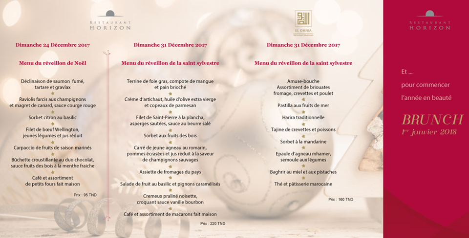 Le Noël c'est avec un menu qui laisse personne indifférent: déclinaison de saumon fumé tartare et gravlax, raviolis farcis aux champignons et magret de canard, sauce courge rouge, sorbet citron au basilic, filet de bœuf Wellington, jeunes légumes et jus réduit, carpaccio de fruits de saison marinés, buchette croustillante au duo chocolat, sauce fruits des bois à la menthe fraiche, café et assortiment de petits fours fait maison. Animation assurée par le Duo Souleima. Prix: 95 dt par personne