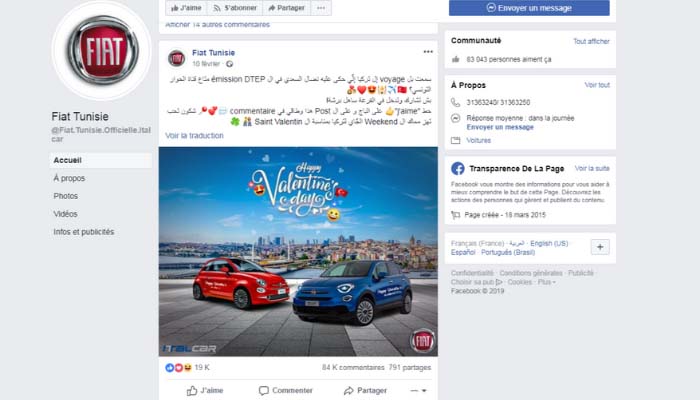 Bien qu’elle ne compte que 83 000 fans, la page officielle de Fiat Tunisie est classée 2e selon de nombre d’interactions.