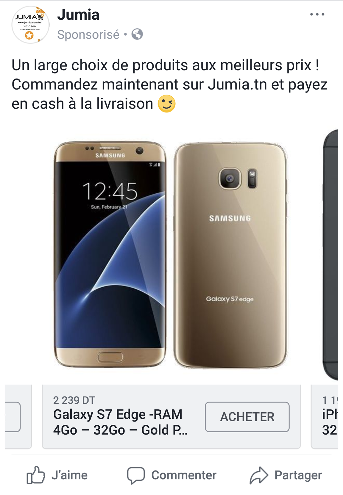 L’utilisation de Facebook est largement répandue en Tunisie. Jumia.tn a compris qu’il pouvait tirer profit de sa présence sur cette plateforme spécialement en tissant des liens réguliers avec ses clients en misant sur la « viralité » de la diffusion du message. De plus Jumia.tn utilise souvent des publications sponsorisées de type carrousel, ce qui permet d’afficher jusqu’à dix produits en même temps tout en défilant facilement les images de ces produits, et ce n'est pas tout il suffit d'un clic pour être redirigé vers le site et ainsi passer à l'acte d'achat.