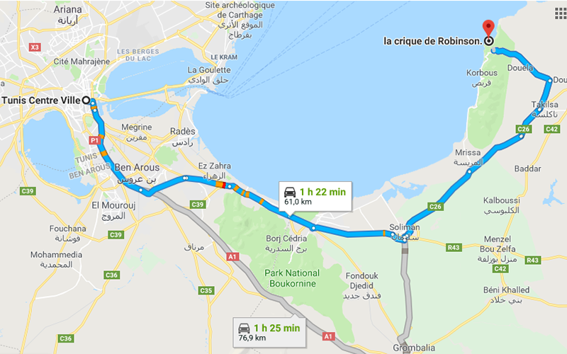 Pour arriver à notre destination, depuis le centre-ville de Tunis on a emprunté les chemins qui mènent à Ben Arous, Ezzahra, Soliman, Mrissa, Takelssa et puis Korbos. Soit environ une heure et 22 minutes de conduite. Une fois arrivé à Ain Atrous, on s’est déplacé vers la crique en bateau qui nous a coûté 20 dt/personne (aller et retour) et là-bas on a été accueilli par l'équipe de "Foued" maître des lieux.