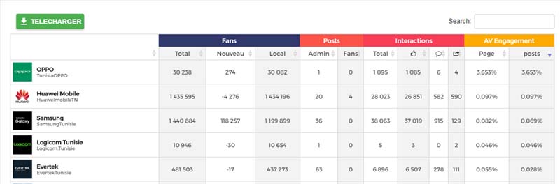 N'hésitez pas à jeter un coup d'oeil sur les autres statistiques de ces pages Facebook dans la capture présente ci-dessous mais aussi à consulter d'autres rapports encore plus détaillés sur pratiquement tous les secteurs en Tunisie en testant la version démo de Kpeiz
