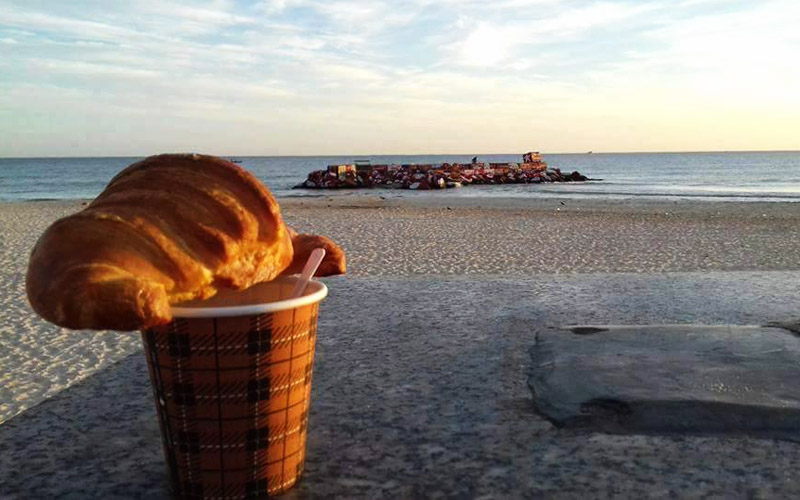 Si vous en avez assez des salons de thé, vous pouvez toujours acheter vos petites gourmandises ; Zlabia, mkharek, croissants etc.… et un verre de thé ou un café dans un gobelet et chercher un coin tranquille au bord de la mer. Une sortie authentique qui sort du quotidien et qui vous fera du bien.