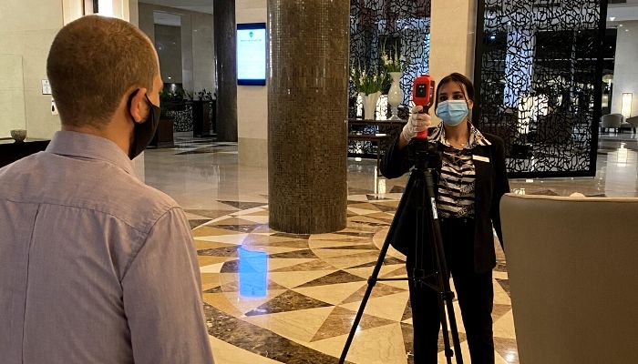 Dès votre entrée à l’hôtel, un membre du personnel vous accueille, prend instantanément votre température corporelle et vous fournit un kit contenant une bavette, des gants et un gel hydro-alcoolique.