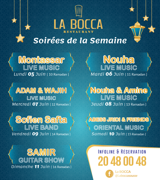 La Bocca propose de la musique live avec un groupe chaque soir pour vous faire vibrer sur des styles musicaux variés. C’est l’endroit idéal pour prendre son verre de thé et fumer sa chicha dans une ambiance ramadanesque extraordinaire. Nous vous laissons découvrir le programme de la semaine ci-dessous;