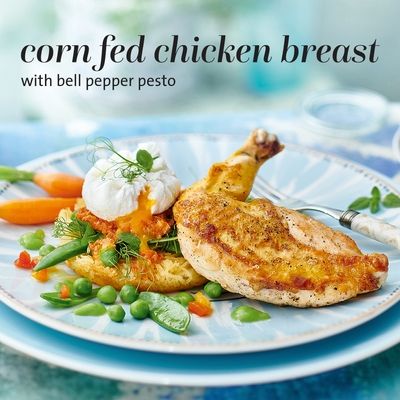 - Corn Fed Chiciken Breast : Le secret de la couleur et du goût des poivrons ne réside pas dans leur variété ou leur maturité. Les poivrons verts ne sont pas tout à fait mûrs et sont légèrement amers, tandis que les poivrons rouges, parfaitement mûrs, sont légèrement sucrés. Notre pesto au poivron jaune et rouge est impressionnant par ses saveurs sucrées et douces.