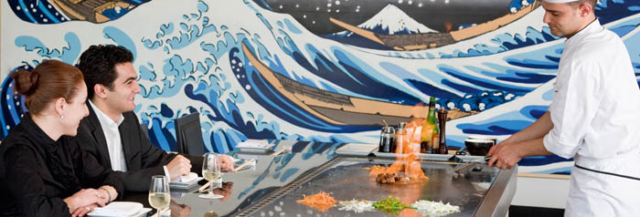 Show cooking et décors typique en noir et blanc avec un plancher en bois, un magnifique endroit pour déguster une cuisine authentique aux saveurs du pays du Soleil-Levant.