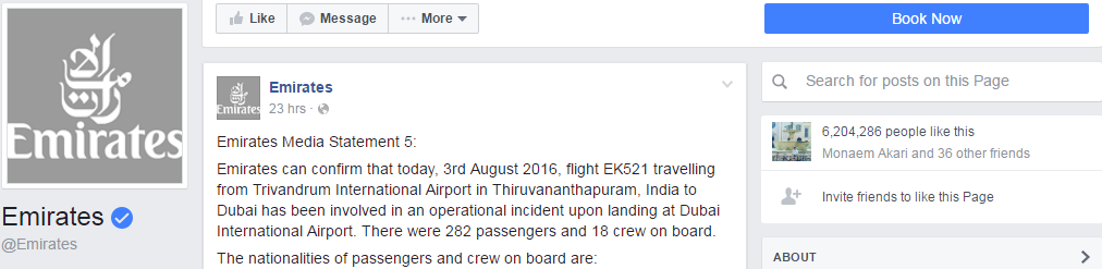 Le 3 août 2016 un avion de la compagnie Emirates s'est enflammé sur la piste de l'aéroport international de Dubaï, durant la procédure d'atterrissage. Au bord de l'avion se trouvaient 282 passagers et 18 membres de l'équipage de vol.