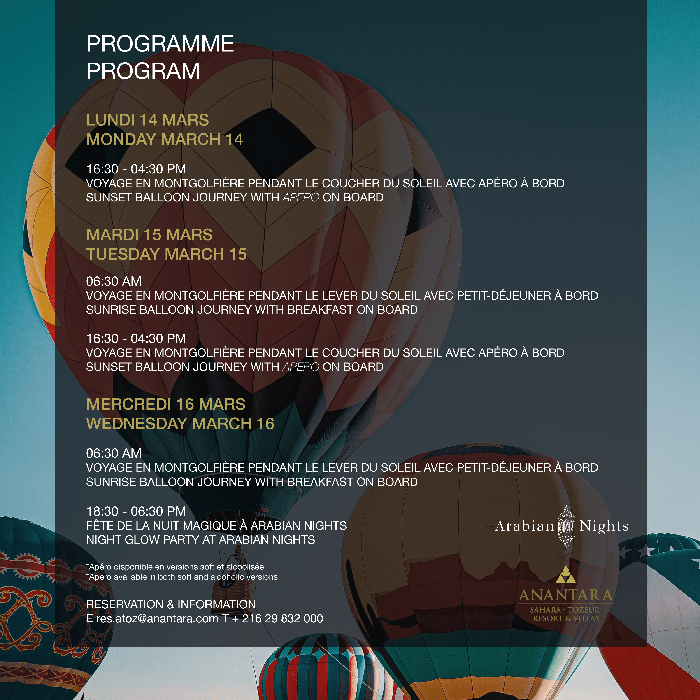 20 montgolfières seront présentent pour un festival de trois jours à Anantara Tozeur, et ce, le 14, 15 et 16 mars 2022