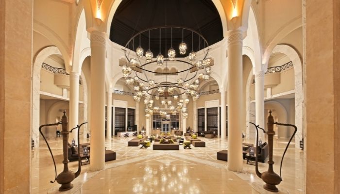 Le confort feutré et l'architecture orientale vous feront immerger dans un autre univers, arcades, fontaines, et colonnades se prolongent dans les jardins somptueux et les piscines qui bordent une immense plage de sable blanc.